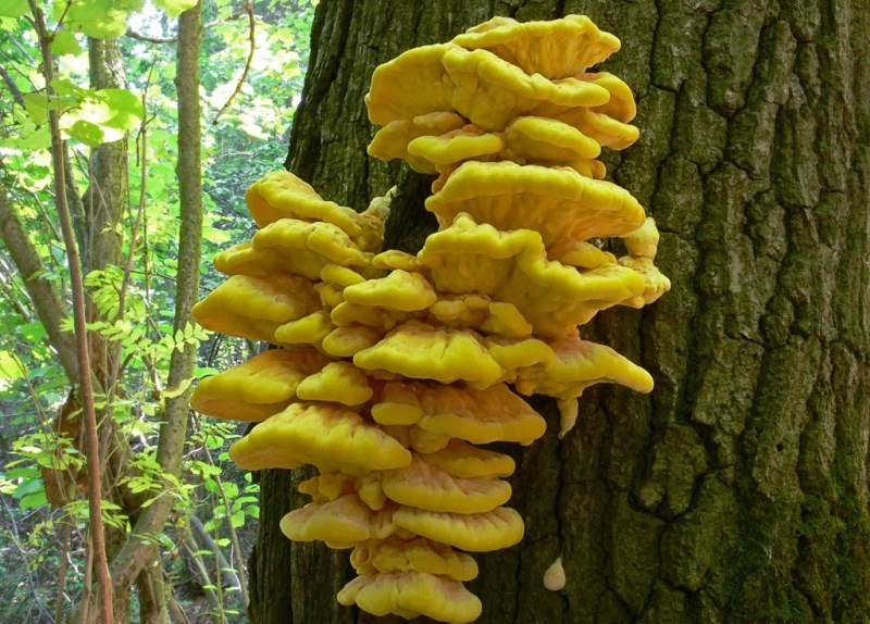 • Сірчано-жовтий трутовик. Сам він плоско-округлий, має жовтуватий відтінок. Ніжка дуже щільна і моментально деревенеющая.