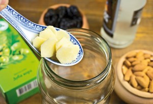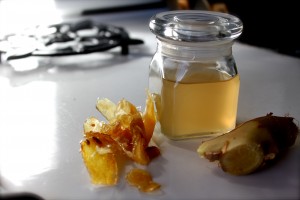 Імбир потрібно нарізати скибочками і помістити в банку, зверху покласти м’якоть цитрусових (лимони в рецепті можна замінити лаймом – 5 шт.), залити все горілкою і водою, добре струснути і помістити в темне місце на тиждень, щодня струшуючи банку. Після того,