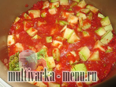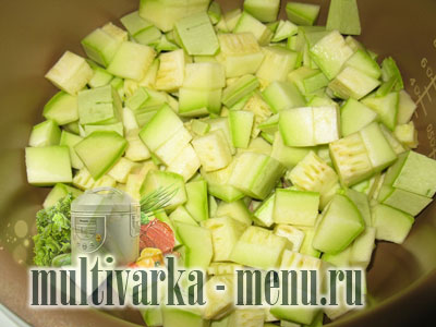 Кабачки беремо звичайного сорту, але молоді і свіжі. Нарізаємо кубиками кабачки і складаємо в чашу мультиварки.