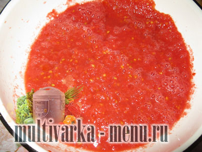 Пропускаємо помідори через м’ясорубку або в блендері подрібнюємо, з шкіркою.