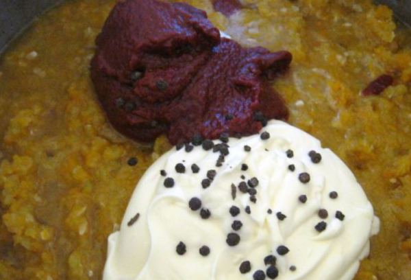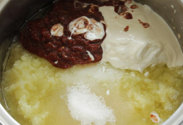 8. В окремій мисці томатне пюре змішують з гарячою водою і майонезом, туди ж відправляють спеції.