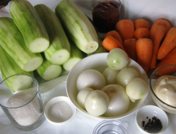 Свіжа морква очищається, подрібнюється терткою для овочів і теж відправляється в ємність з цибулею. Кабачки нарізають шматочками середнього розміру, овочі відправляють в каструлю. У ємність додають 150 мл соняшникової олії, туди ж відправляють томатну пасту і 300 грамів майонезу.