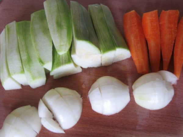 Кабачки промивають і відрізають у плодів кінчики. Моркву очищають і промивають, також надходять з ріпчастою цибулею. Кабачки нарізають великими кубиками, цибулю подрібнюють кільцями, моркву слід нарізати кружечками.