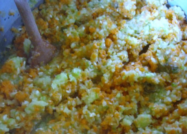 2. Овочі та яблука нарізують шматочками і подрібнюють м’ясорубкою, щоб отримати овочеве пюре.