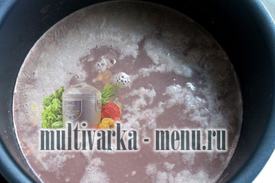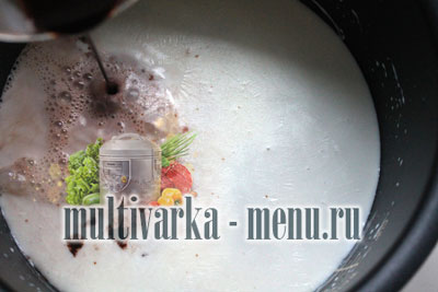 Тим часом наше молоко закипіло, тому акуратно вливаємо нашу отриману заготовку в чашу мультиварки. Продовжуємо готувати в тому ж режимі 10 хвилин при закритій кришці.