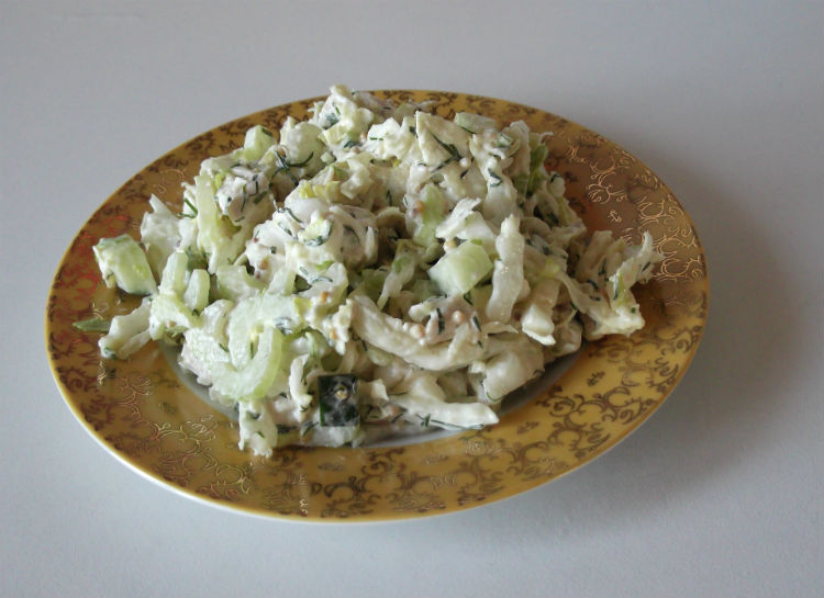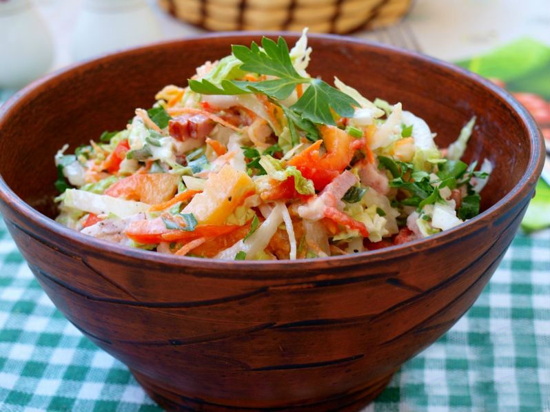 Порада: якщо вас хвилює скільки калорій в салаті з капусти, то є одна хитрість. Калорійність страви можна знизити, якщо додати замість майонезу нежирний йогурт або знежирену сметану.