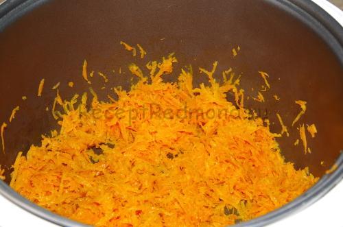 Натріть на тертці моркву так, щоб вона вийшла довгими смужками. Якщо у вас є терка для корейської моркви — це те, що треба. На режимі смаження в мультиварці Редмонд протягом 5-7 хвилин трохи пригасите її в олії, так, щоб вона стала м’якою.