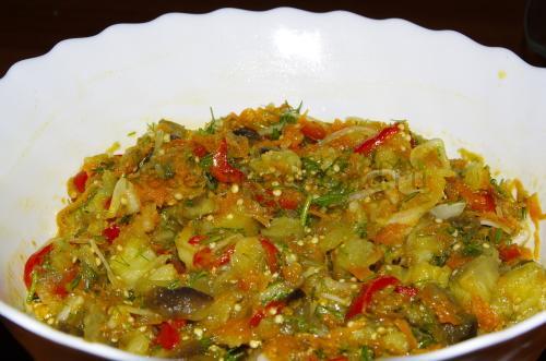Змішайте у великій тарілці всі інгредієнти, додайте туди дрібно нарізаний кріп і видавлений часник і ваше блюдо готове. Пікантні і екзотичні баклажани, я впевнена, стануть завсідником на вашому столі в будні і свята.