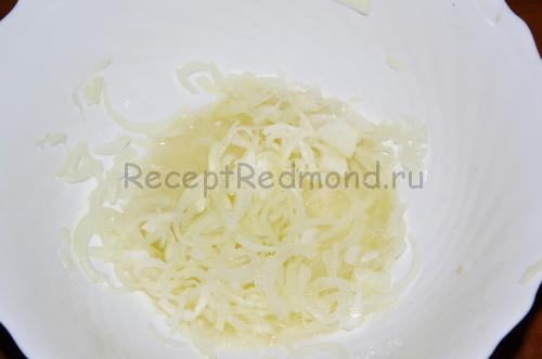 Наріжте цибулю тонкими півкільцями і залийте оцтом з цукром. Того часу (15 хвилин), яке піде на варіння і смаження інших овочів, буде досить, щоб він замариновался.