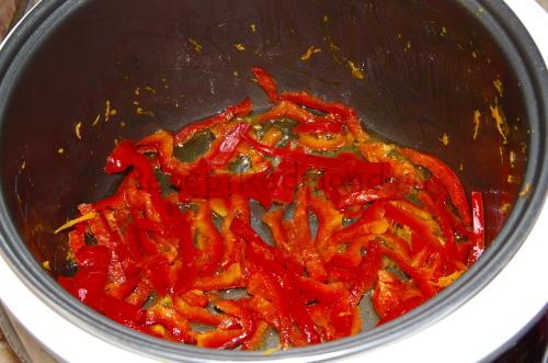 Наріжте перець півкільцями і ще 5 хвилин обсмажуйте його в однойменному режимі. При приготуванні кисло-солодкого салату з баклажанів можна взагалі не обсмажувати овочі, але в цьому випадку моркву і перець будуть набагато жорсткішими на смак.