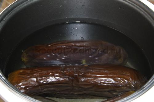 Відваріть в сильно підсоленій воді баклажани до готовності — мені вистачило 15 хвилин в режимі гасіння, щоб вони стали м’якими. Не бійтеся кількість солі 2 ст. л. (на літр води) обов’язково кладіть з гіркою, інакше смачних синіх не приготувати. Баклажани в кисло-солодкому соусі при недостатній просоленности вберуть смак підливи і буде вже не те.