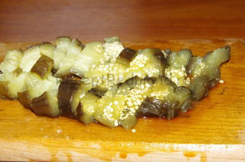 Охолодіть сині, зніміть з них шкірку і наріжте невеликими кубиками.