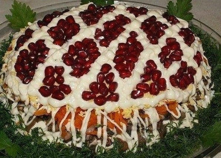 Дане блюдо з м’ясом птиці дуже незвичайне, так як в ньому два види м’яса, які роблять страву дуже ситним і приємним на смак. Незважаючи на це, закуска виходить не жирною. Також інші продукти, які доповнюють страва, є дуже корисними і потрібними для організму. Красива подача може сподобатися всім, тому салат рекомендований для святкового столу.