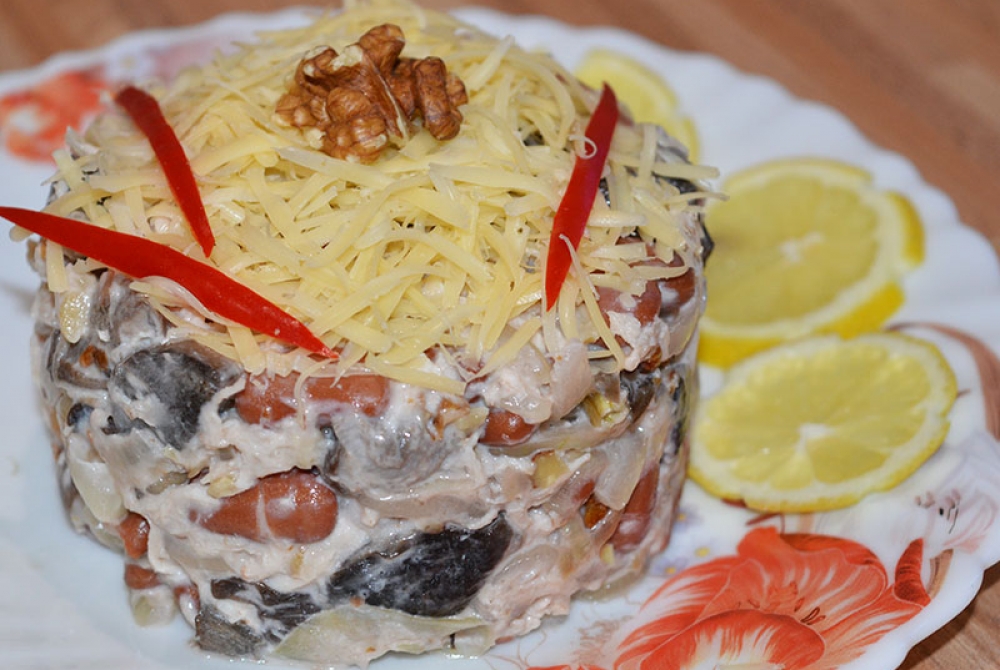 Звичайний салат з куркою і грибами, доповнений маринованої, червоною квасолею, зазвичай расхватывается в першу чергу. Вся справа в правильно підібраних інгредієнтів, які відмінно гармонують між собою, створюючи справжній кулінарний шедевр. Вся справа в тому, що продукти зіставлені в правильній пропорції, звідси основним продуктом буде куряче філе, потім буде відчуватися грибний присмак, а вже квасоля відходить на другорядний, але в той же час, головне місце.