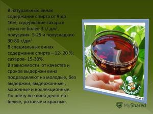 Воно може бути кріпленим, столовим і міцним, і кожен з них відрізняється своїми особливостями. На цих нюансах заснована класифікація вин по змісту цукру: