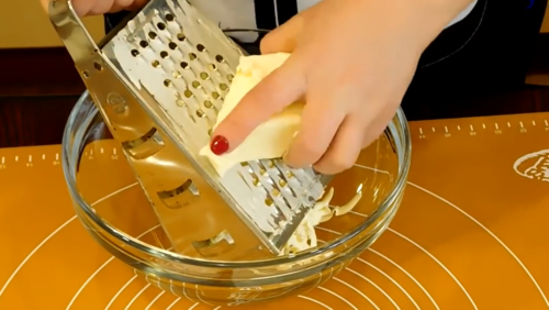 - Для початку процесу, натираємо на крупній тертці вершкове масло, попередньо заморожене, прямо в суху суміш.