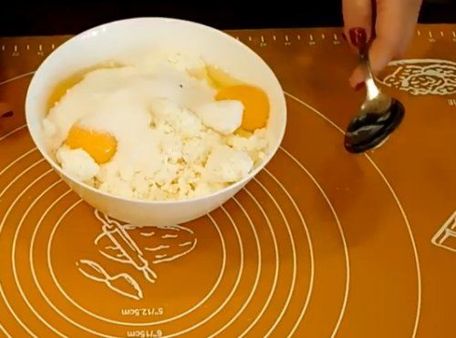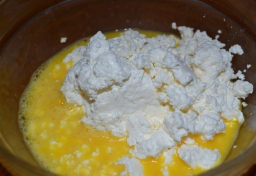 - До розтертої до однорідності сирної маси додаємо яйця, знову все ретельно перемішуємо.