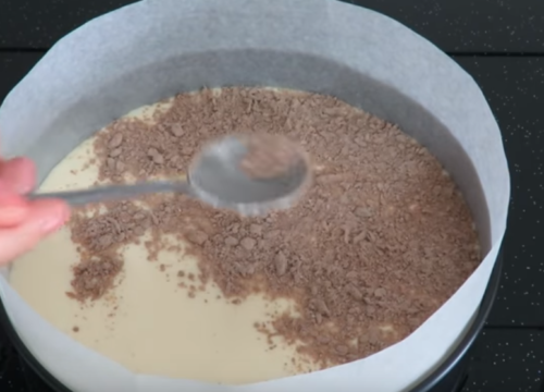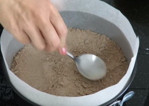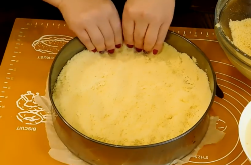 - Викладаємо більшу половину олійно-борошняних крихт у форму, розрівнюємо поверхню, але не ущільнюємо.