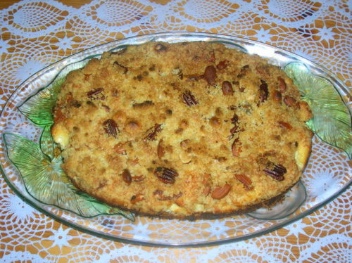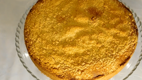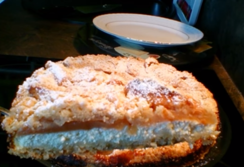 - Завершальним шаром рівномірно насипаємо на королівську ватрушку з сиром залишилася олійно-борошняну крихту.