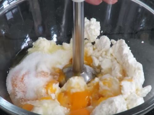 - Для начинки змішуємо сир з яйцями, цукром і ваніліном. Отриману сирну суміш доводимо до однорідного стану за допомогою заглибного блендера.