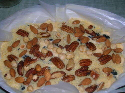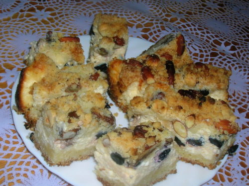 - Змішуємо промитий і просушений ізюм з горіховою сумішшю. Розподіляємо все по поверхні сирної начинки.