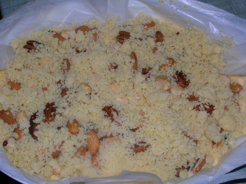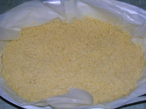 - До потрібного моменту витягаємо насипне тісто і ділимо його на дві нерівні частини. Більшу частину викладаємо у форму для випікання, розрівнюємо поверхню, але не ущільнюємо.