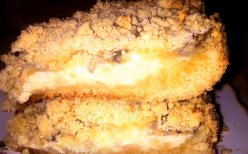 - Викладаємо начинку з сиру на поверхню з насипного тіста, розрівнюємо. Зверху насипаємо залишилася крихту.
