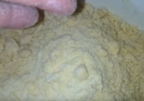 - Потім розтираємо масло і борошно в крихту руками. Процес можна затягувати, інакше пісочне тісто вийде злитим, а не розсипчастим.
