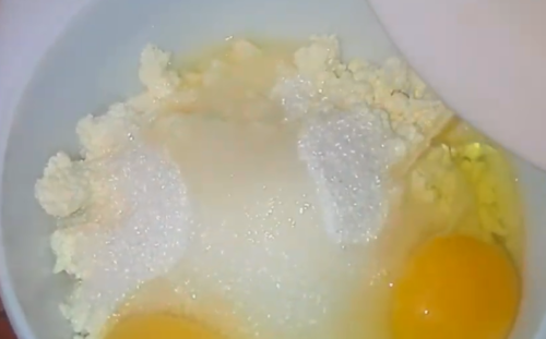 - Поки вистоюється тісто, готуємо начинку. Для чого розтираємо сир з цукром і яйцями.