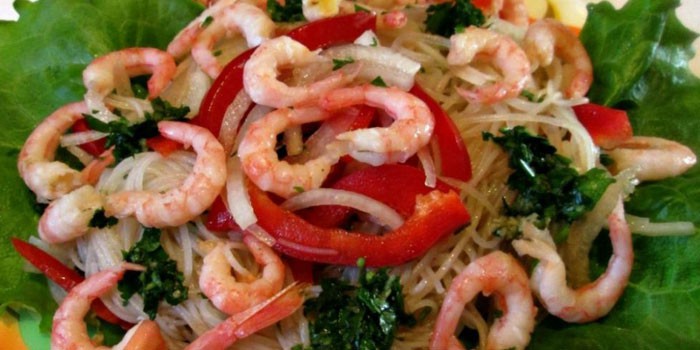 Оригінальне блюдо азіатської кухні, яке користується успіхом на наших застіллях, – легкий салат з креветок і крабових паличок, який прийнято подавати теплим. Пікантне пряне поєднання китайської локшини і соку лайма з авокадо і петрушкою прекрасно відтіняє знайомий смак морепродуктів. Якщо ви не любите креветки, спробуйте додати мідії або гребінці.