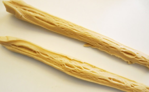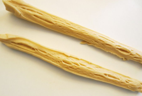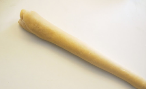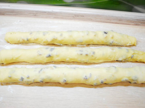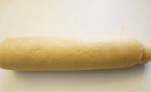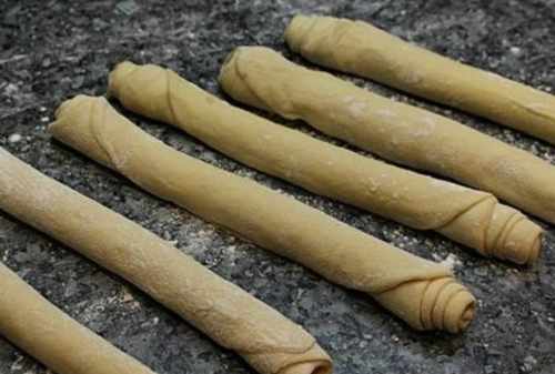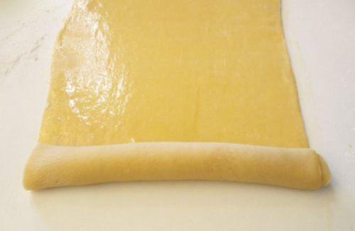 • Готову основу для випічки ділимо на 6 рівних частин, кожну розкачуємо в прямокутник розмірами 20 на 50 см, змащуємо м’яким маслом і звертаємо рулетом.