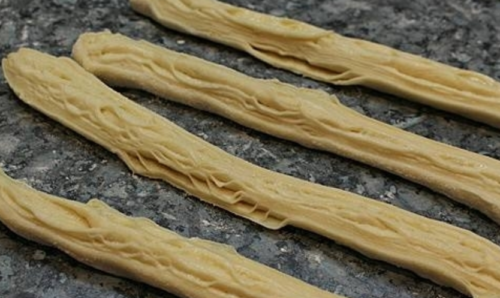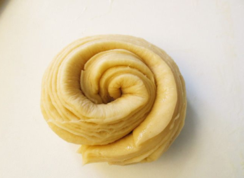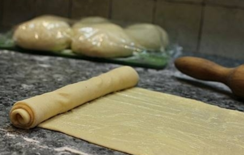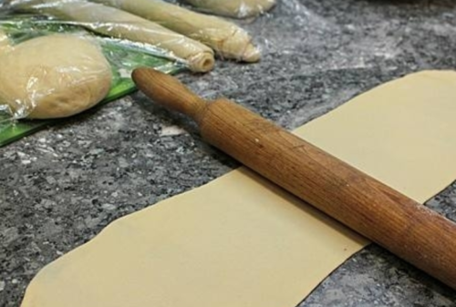 • Тісто ділимо на 5-6 рівних частин, робимо заготовки у вигляді пласта, кожен з яких змащуємо маслом, потім згортаємо в рулет.