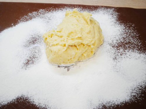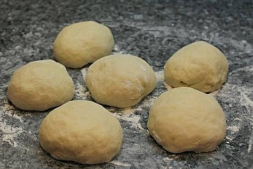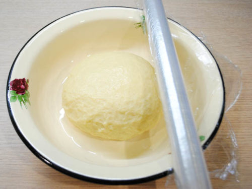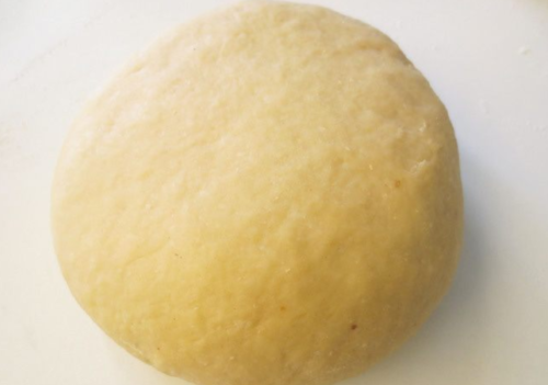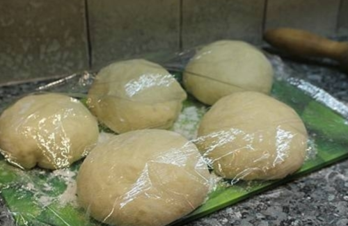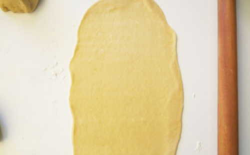 • Тісто ділимо на 3 частини приблизно по 230 г, накриваємо плівкою і через 15 хвилин розгортаємо в тонкий пласт.