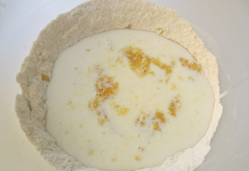 • Робимо в сухої суміші поглиблення, вливаємо в нього масло, вбиваємо яйце і засипаємо дріжджі.