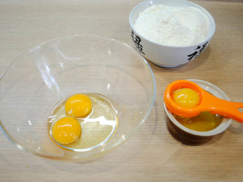 • В окремій ємності збиваємо одне ціле яйце і 2 жовтки разом з буряковим цукром до пишності. Можна взяти просто два яйця, але так тісто виходить більш красивим з жовтуватим відтінком і чим яскравіше будуть жовтки, тим кращий результат.