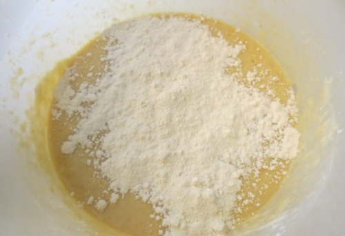• Слідом за дріжджами засипаємо ложечку цукру і пару ложок борошна, ще раз розмішуємо, прикриваємо і залишаємо для підйому на півгодини.