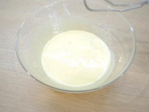 • Молочний напій прогріваємо до температура не більше 35°С, засипаємо в нього дріжджі, розмішуємо. Тут дуже важливо, щоб молоко було злегка теплим, а не гарячим, інакше дріжджові грибки загинуть і тісто вийде жорстким, а не пишним.
