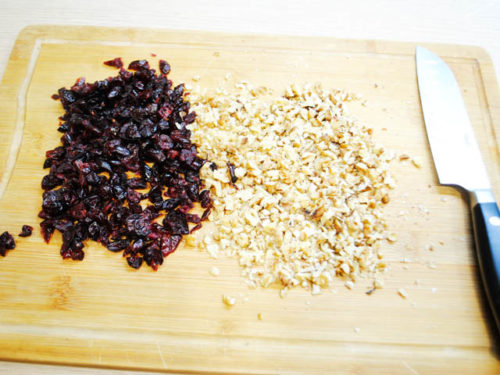 • Поки опара на підході, просіваємо борошно в глибоку миску, журавлину або родзинки промиваємо і просушуємо, горіхи подрібнюємо.