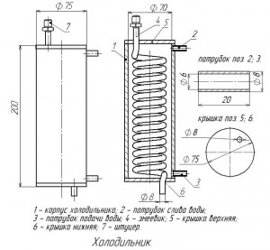 Практично всі креслення для самогонних апаратів мають холодильник, як складову частину. Діє він завдяки тому, що деталі є трубка меншого розміру, а між ними проходить холодна вода. За рахунок цього на виході ви отримаєте вже очищене і охолоджене самогон.