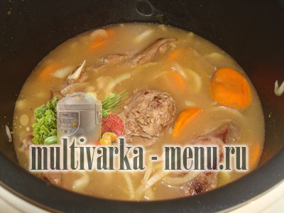 Тепер потрібно змінити режим на мультиарке. Включаємо режим «Гасіння». І в чашу мультиварки, де у нас обсмажене м’ясо і овочі додаємо воду, щоб протушкувати все. Коли вода закипить, знімаємо пінку і тушкуємо 30 хвилин.
