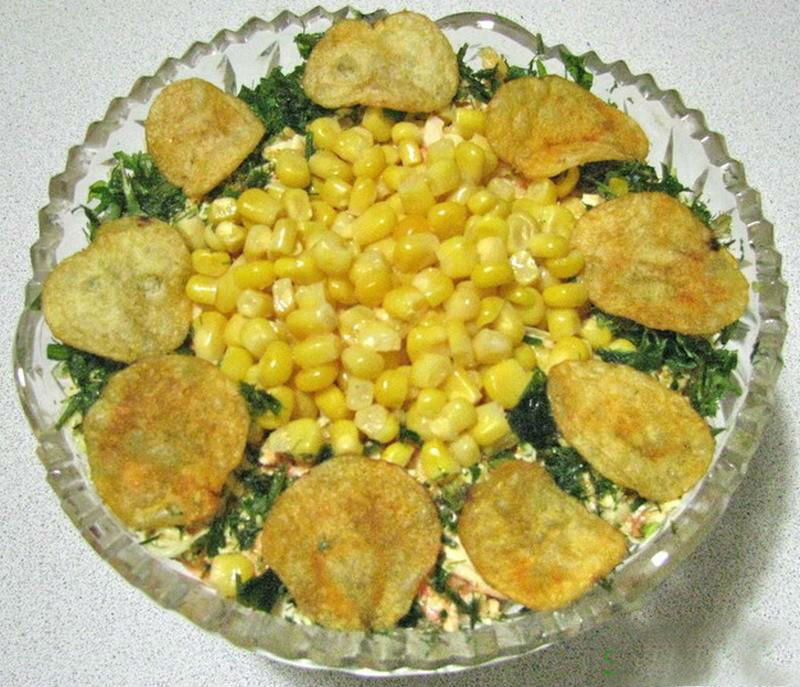 Порада: салат з синьої капустою і кукурудзою можна робити і не листковим, але чіпси обов’язково залишати наостанок зверху. До майонезу додати трохи вимитої і нашаткованої зелені, пару крапель лимонного соку. Горбушу в такому випадку поріжте на невеликі шматочки. Обов’язково вибирайте якісні консерви: банку не повинна бути роздутою, у зазначеному на упаковці складі не має нічого бентежити, риба повинна мати правильну структуру і гарний запах. В іншому разі можна серйозно отруїтися.