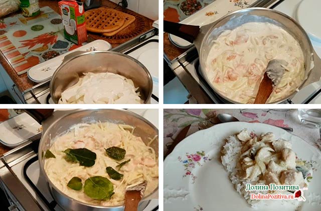 6. Додайте до цибулі курку, соус. Перемішайте. Тушкуйте під кришкою 10 хвилин.