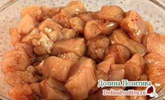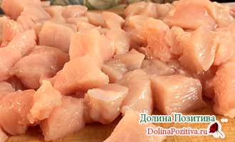 Курячу грудку сполосніть. Обсушіть від вологи. Наріжте смужками вздовж, потім упоперек на шматочки.