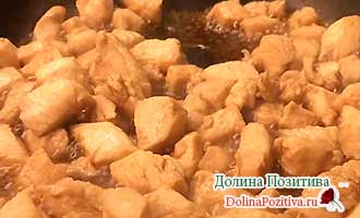 4. На сковороді прогрійте масло. Викладіть курку. Смажте шматки з кожної сторони по 2-3 хвилини. Перекладіть в тарілку.