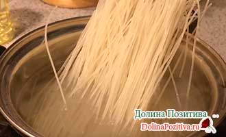 В киплячу солону воду відправте рисову локшину. Варіть близько 10 хвилин. Після варіння відвар злийте.