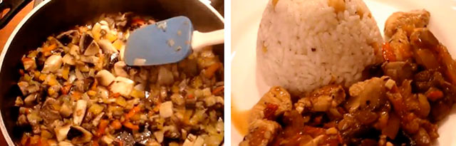 Розігрійте на сковороді будь-масло (соняшникова, оливкова або вершкове). Поріжте цибулю і перець дрібними кубиками. Помістіть їх на гарячу сковорідку. Злегка обсмажте.М’ясо і печериці розділіть на невеликі шматки приблизно одного розміру. Спочатку гриби посмажте разом з овочами, потім приєднайте шматочки м’яса.Під час смаження не закривайте кришку і не зменшуйте вогонь. Нехай процес проходить інтенсивно, а продукти на сковороді зарум’яняться.Дрібно поріжте стиглий помідор, порубаєте часник. Приєднайте на сковороду до овочів, м’яса та грибів. Додайте сіль, гострий перець і орегано. Закрийте кришкою. Варіть 7-10 хвилин до готовності на слабкому вогні.Курка в клярі