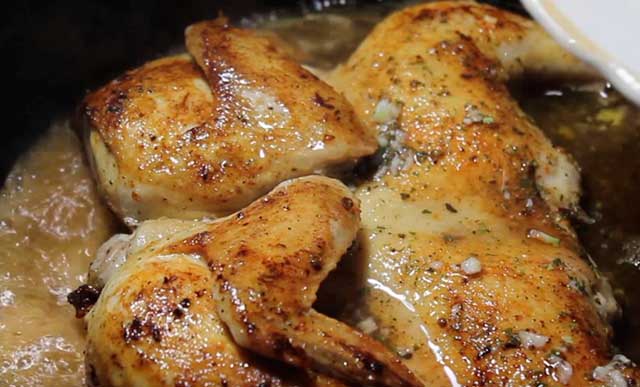 Надріжте тушку посередині вздовж грудки. Обсипте обидві сторони сіллю і перцем. Хочете поекспериментувати з приправами?Використовуйте коріандр або інші прянощі на свій смак.Розігрійте на сковороді вершкове масло. Покладіть курчати розрізом вниз. Накрийте тарілкою, поверх якої використовуйте гніт.Обсмажуйте 7-8 хвилин.Переверніть тушку. Обсмажте.Часникові зубчики вичавити через прес, додати паприку і хмелі-сунелі. Залийте окропом.Вилийте рідкий соус в сковороду з куркою, додати дрібно посічену зелень. Закрийте кришкою і тушкуйте 20-25 хвилин.Курячі ніжки з медом на сковороді