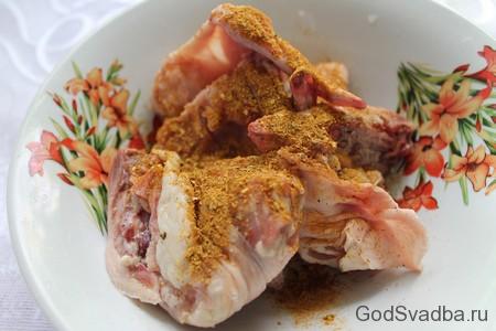 - На курку висипати приправу, перець і сіль.