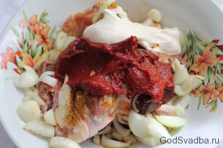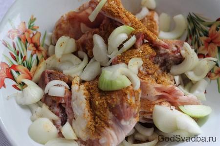 - Висипати цибульну нарізку в таз з куркою. Не шкодуйте лука, його має бути десь приблизно третя частина від кількості м’яса.