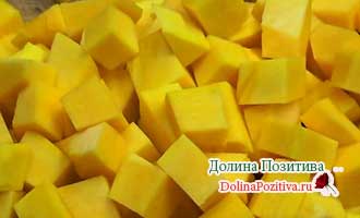 Гарбуз очищаємо, м’якоть нарізаємо на кубики.